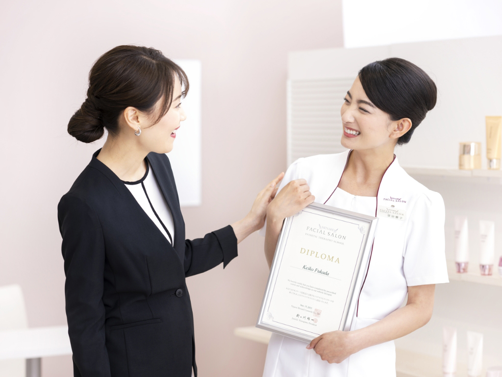 必要な技術と知識を学び、ディプロマ(メナード認定証)を取得できるので、手に職をつけたい方にもぴったりのお仕事です。ご自身のユニフォームや化粧品などの費用が